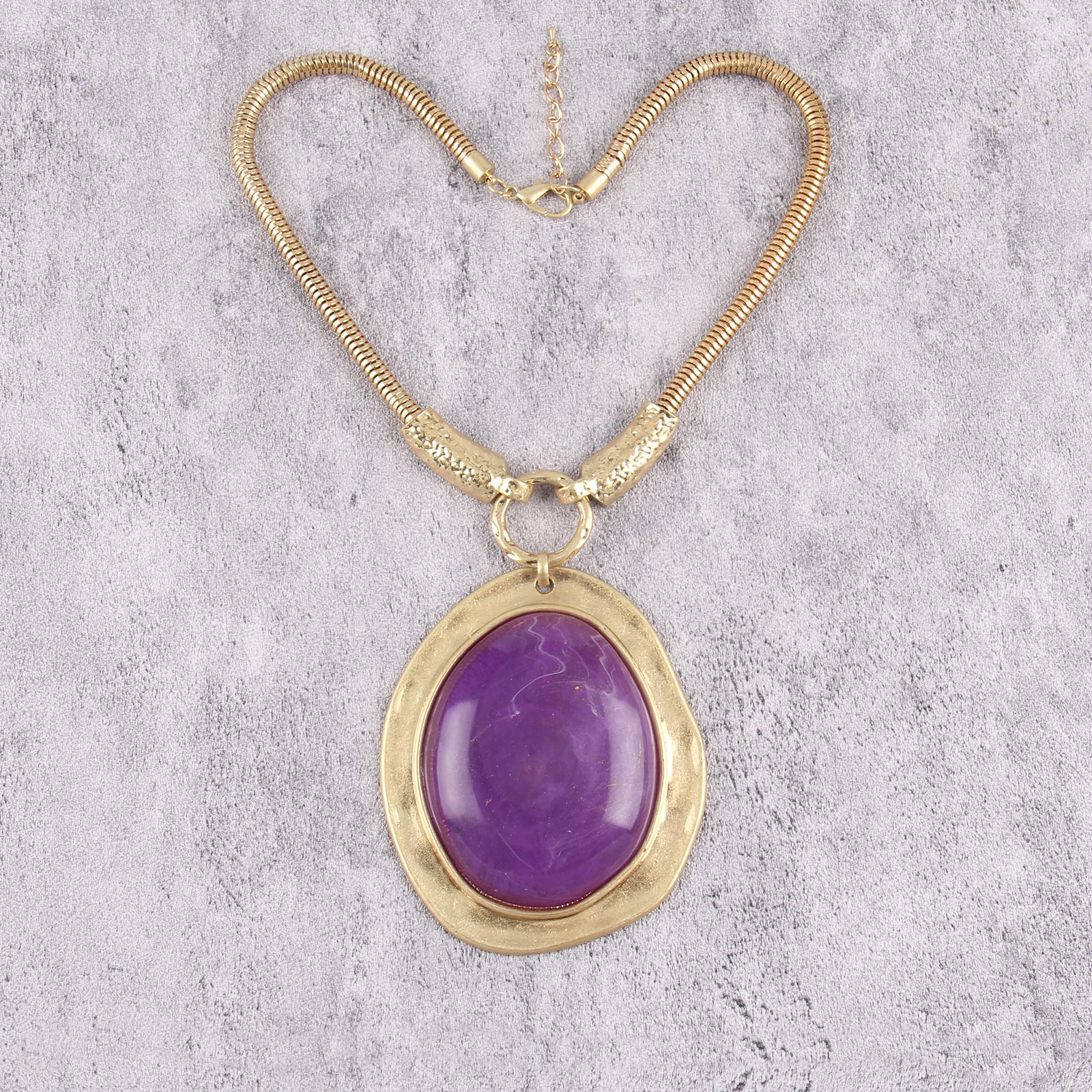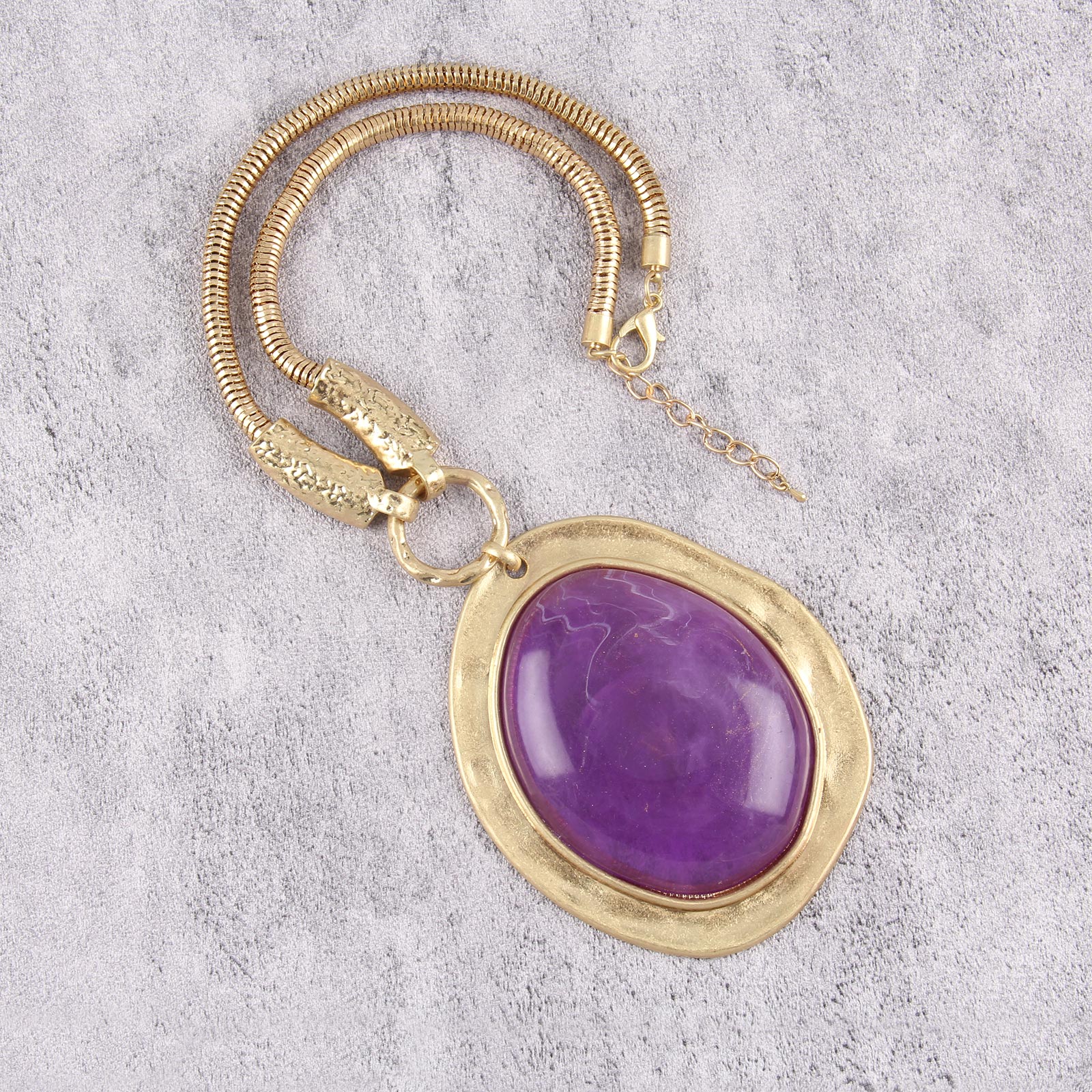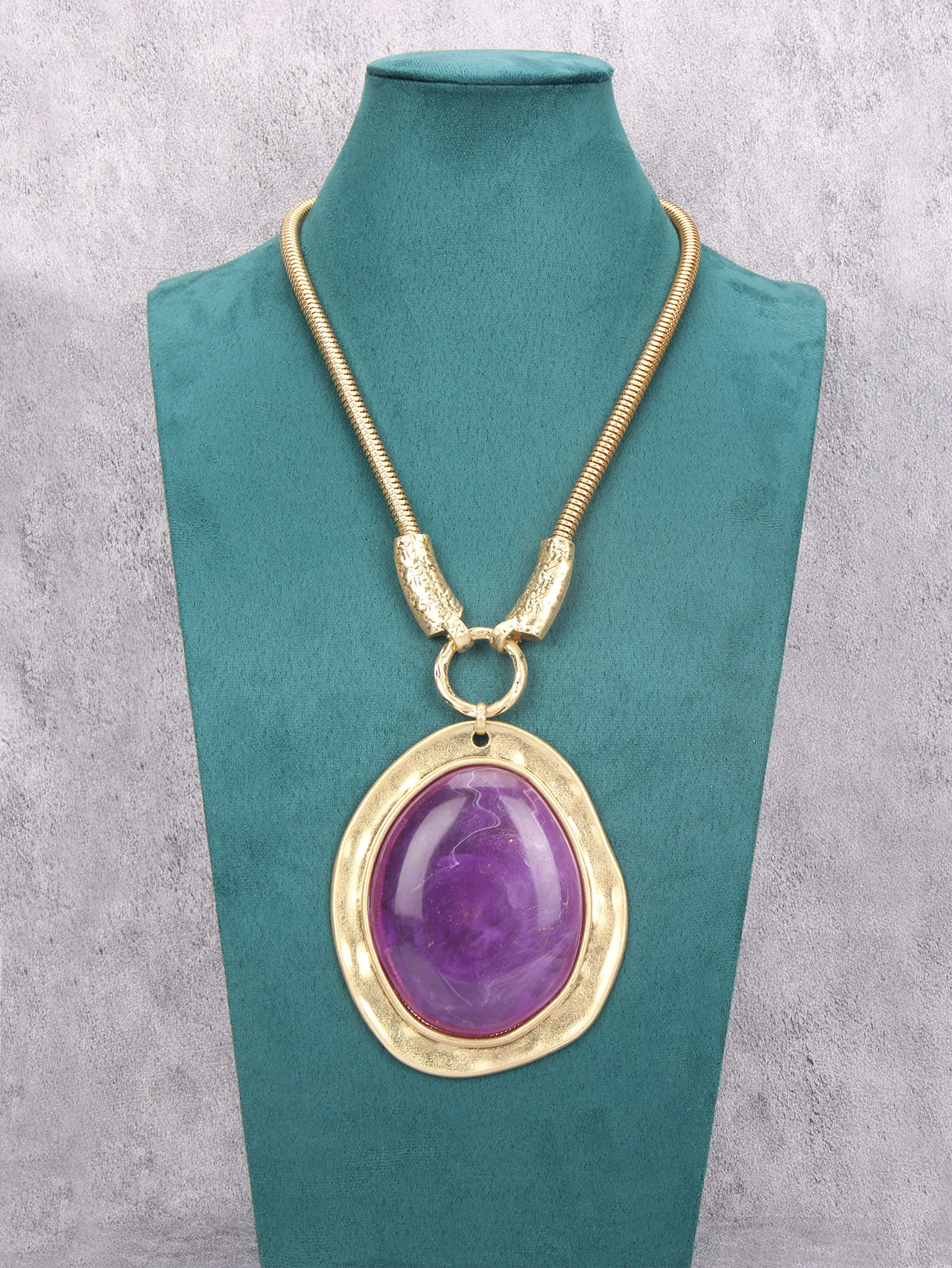Make a bold statement with this exquisite gold-tone necklace featuring a striking purple gemstone centerpiece.