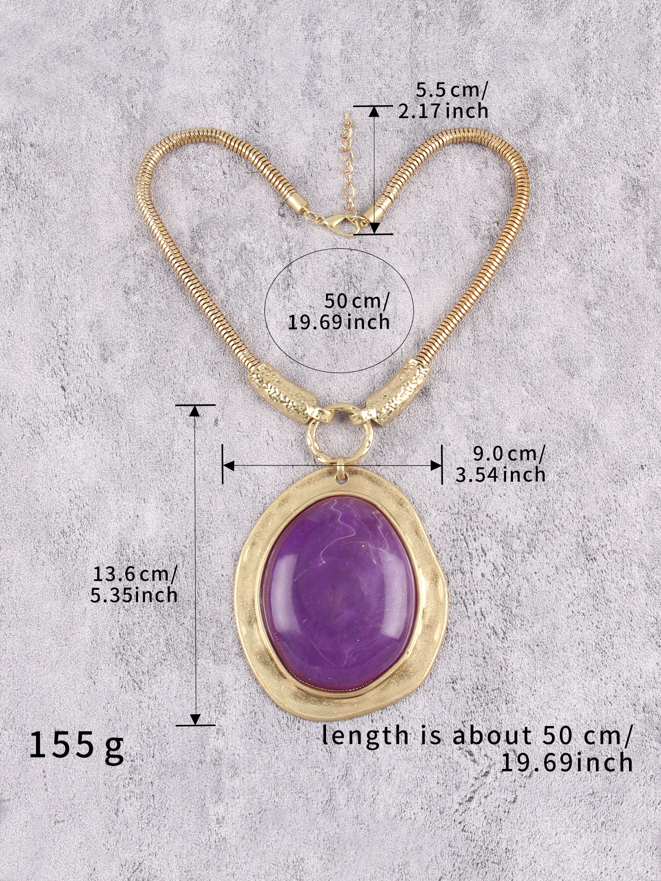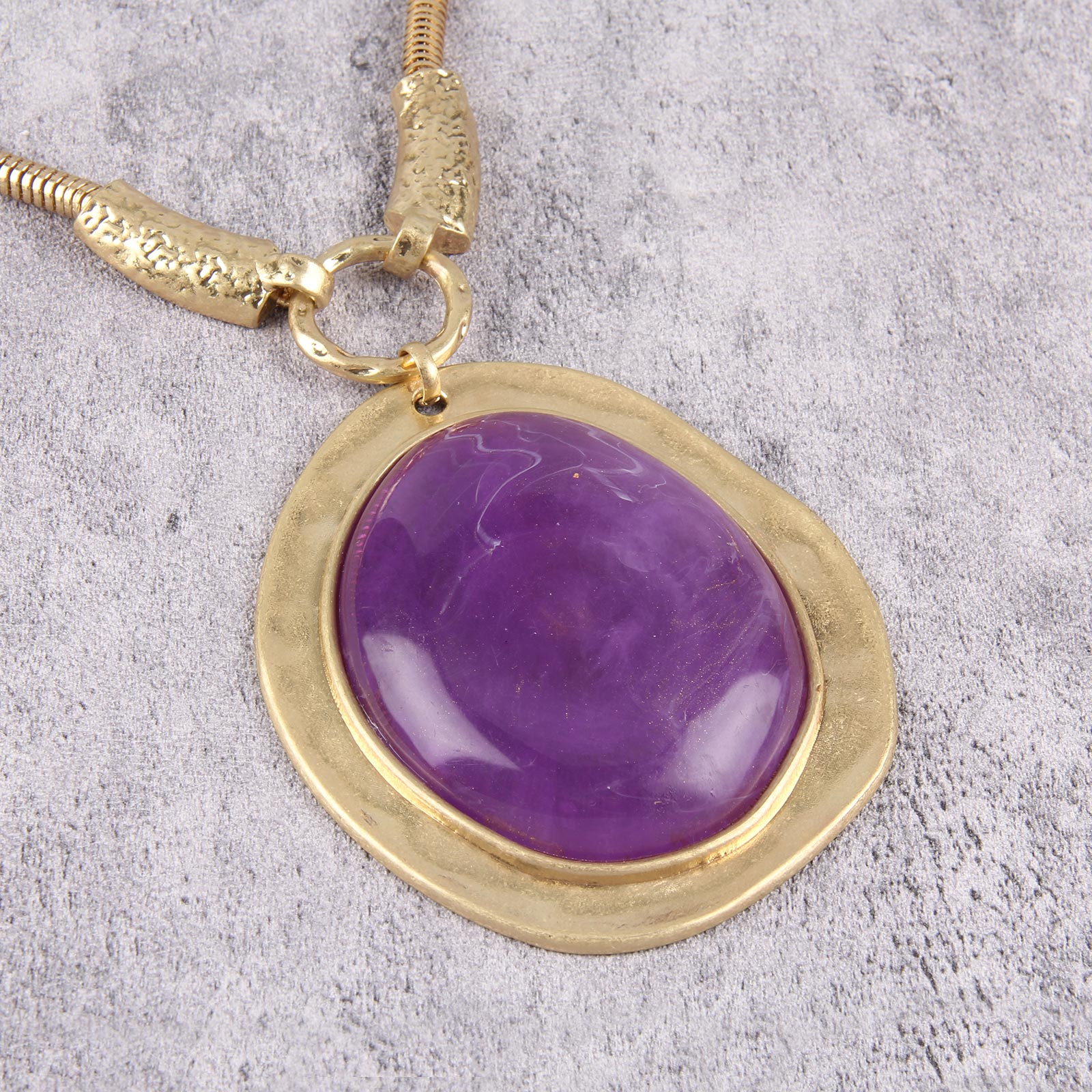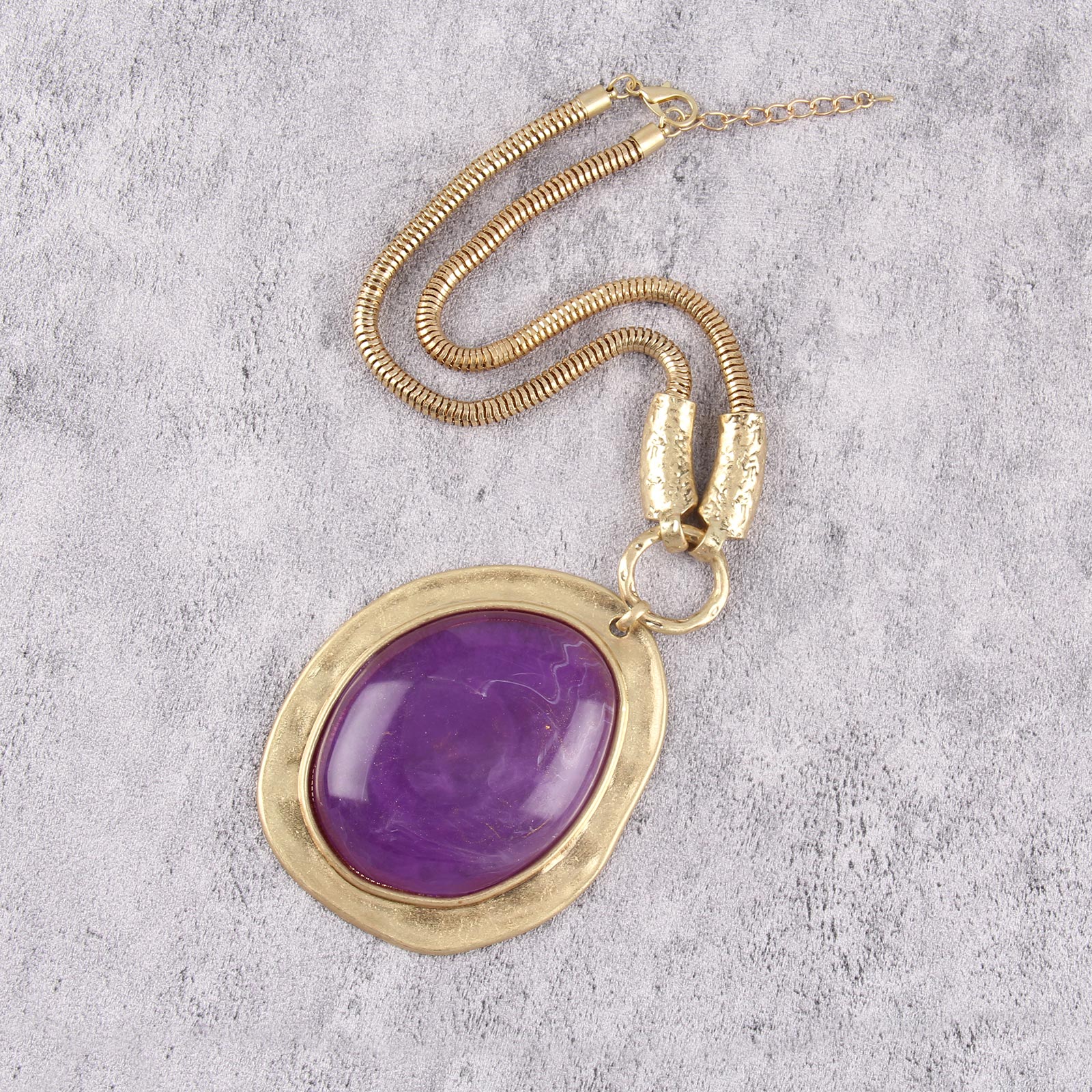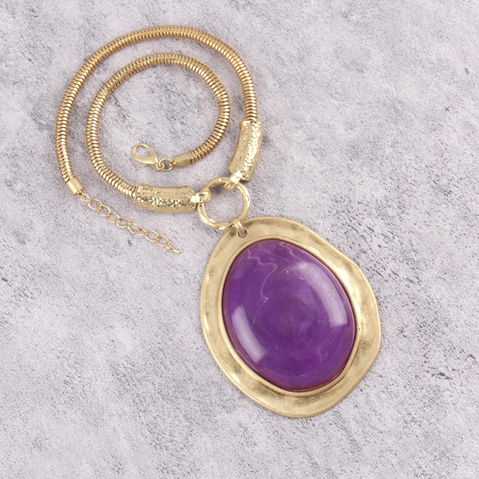 Make a bold statement with this exquisite gold-tone necklace featuring a striking purple gemstone centerpiece.