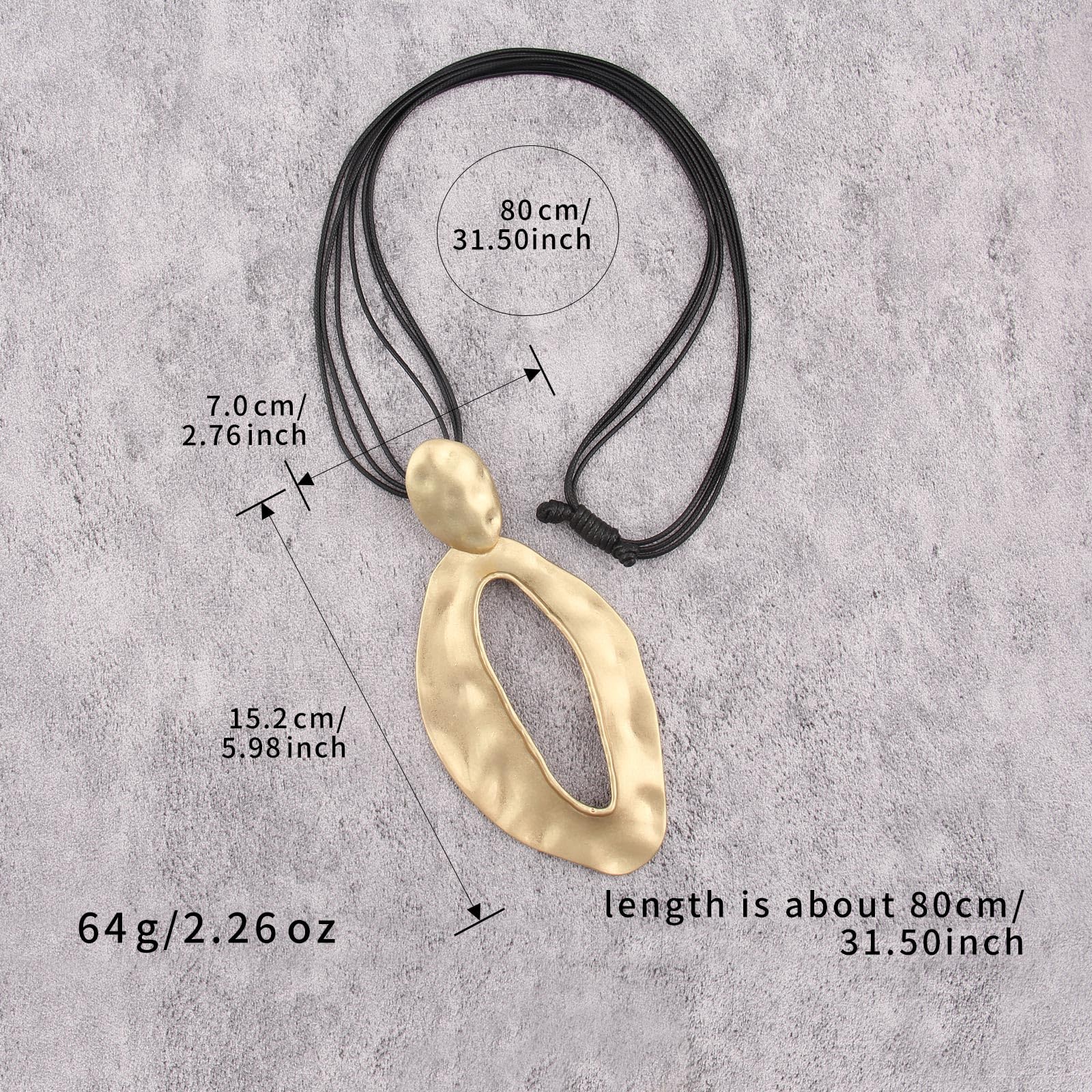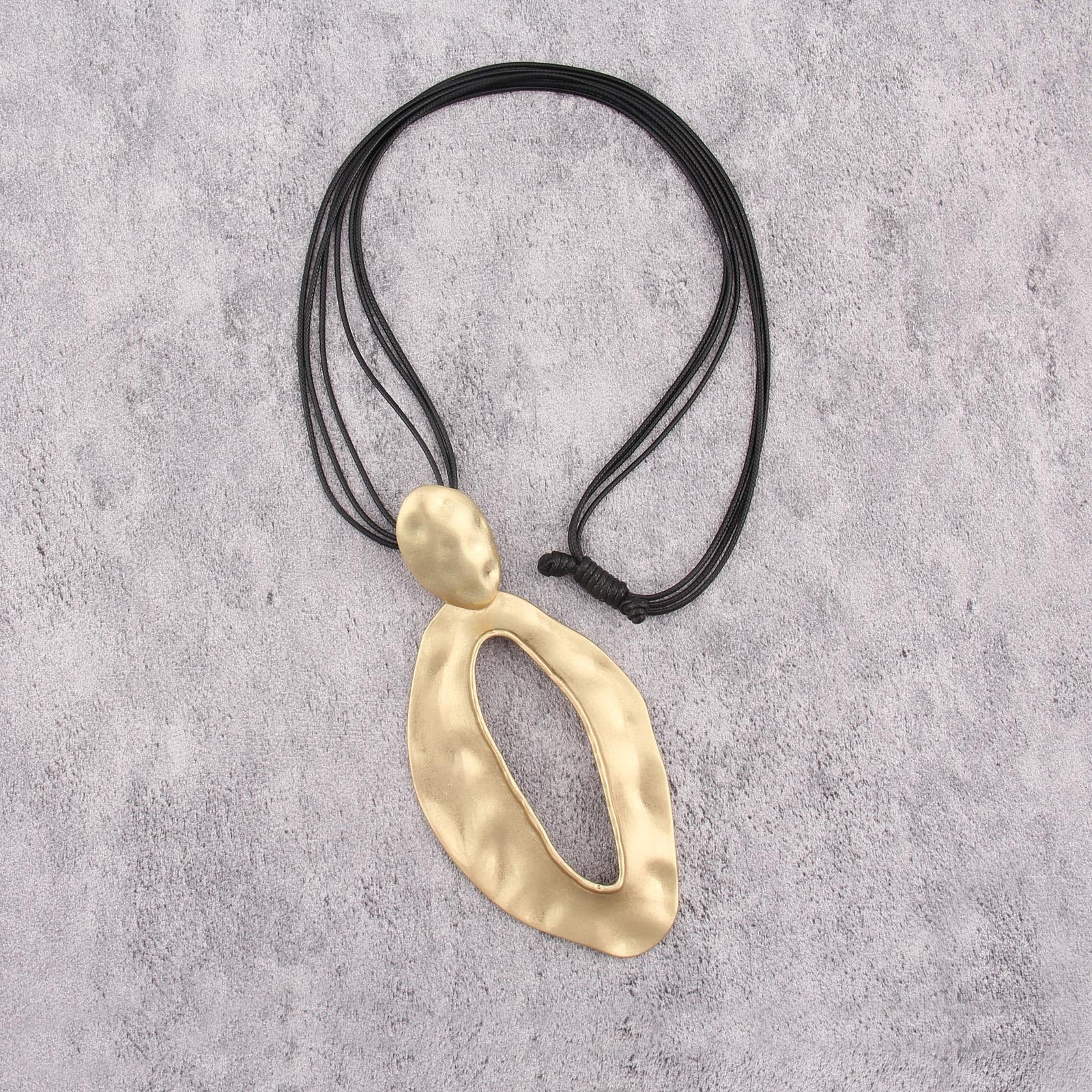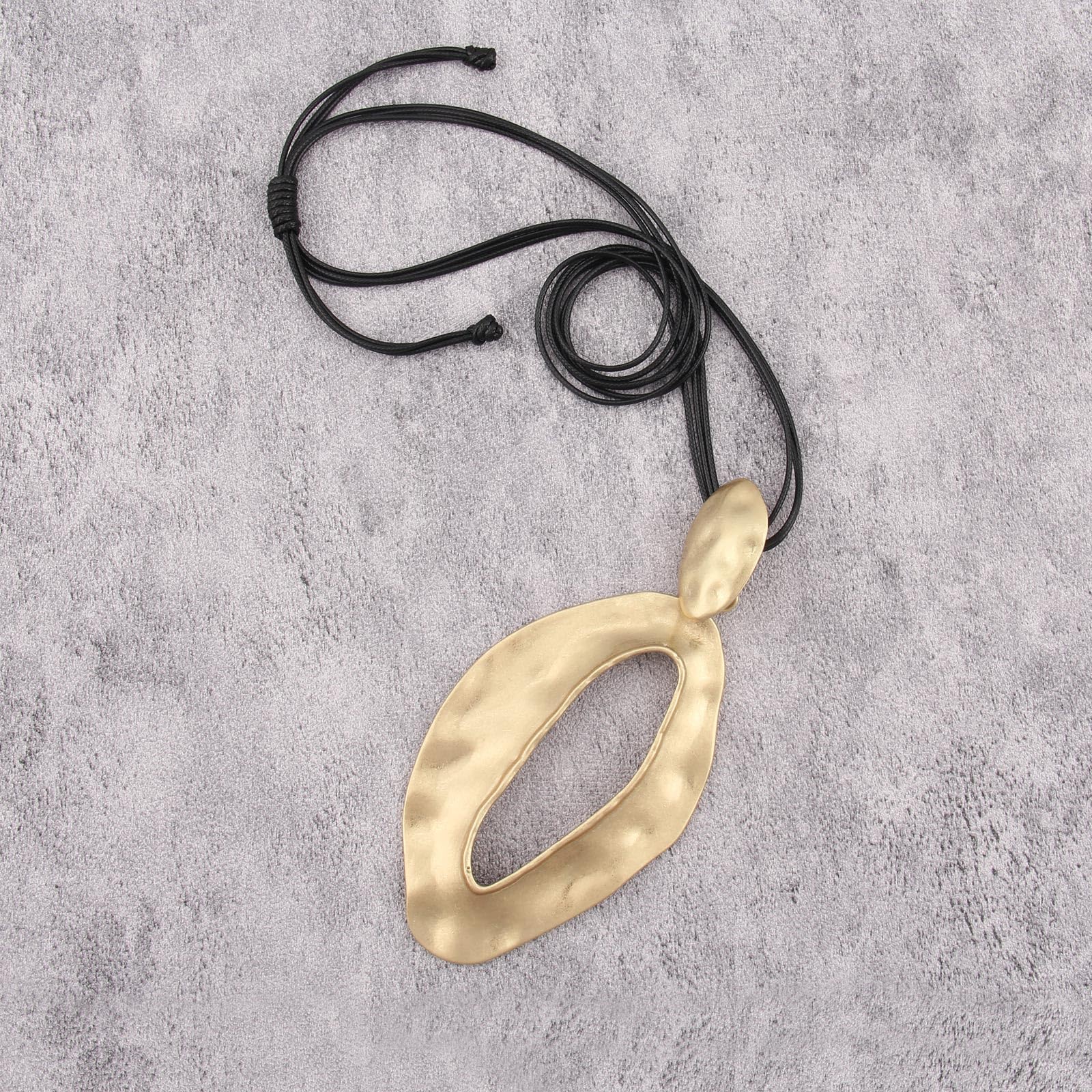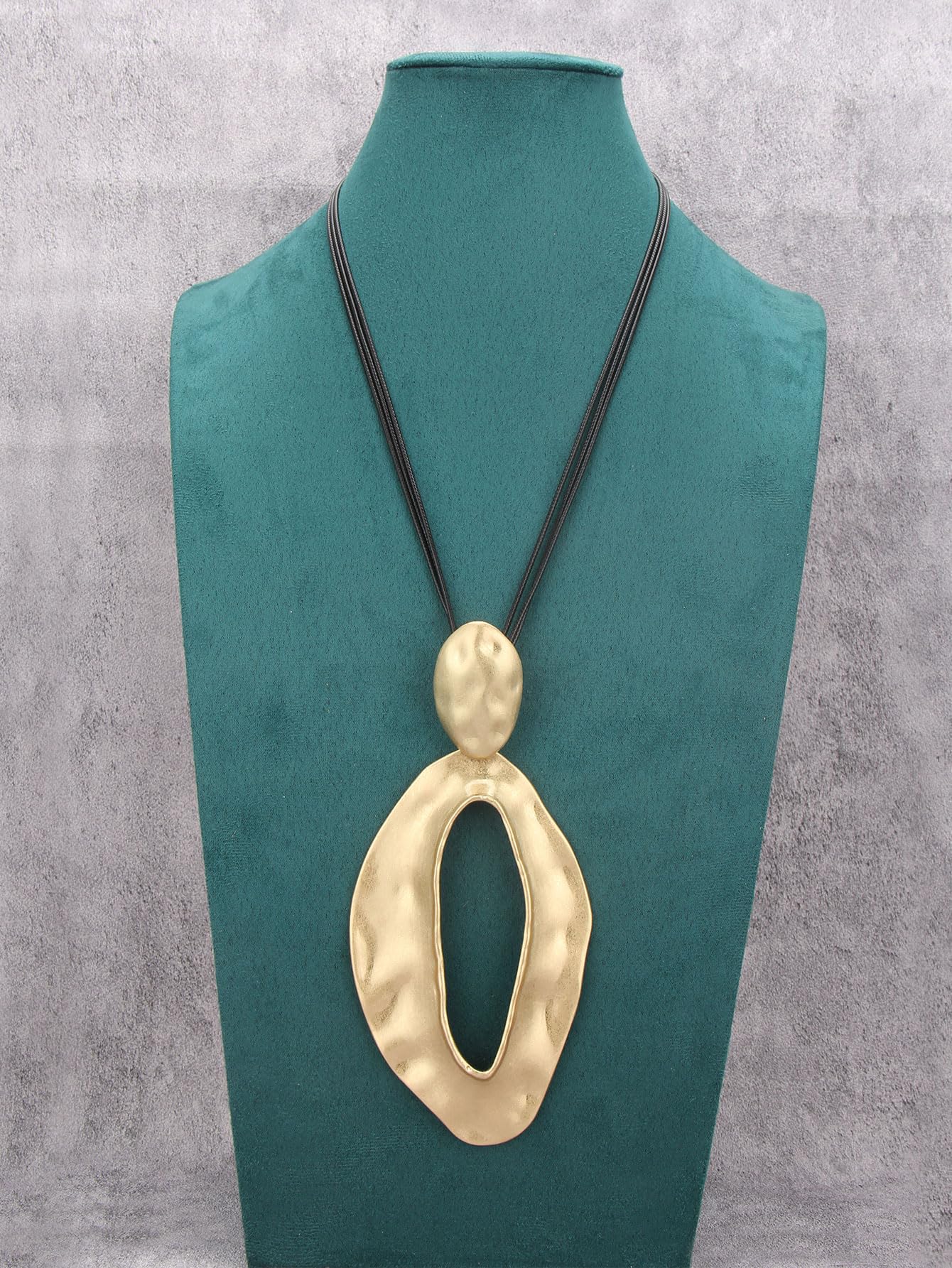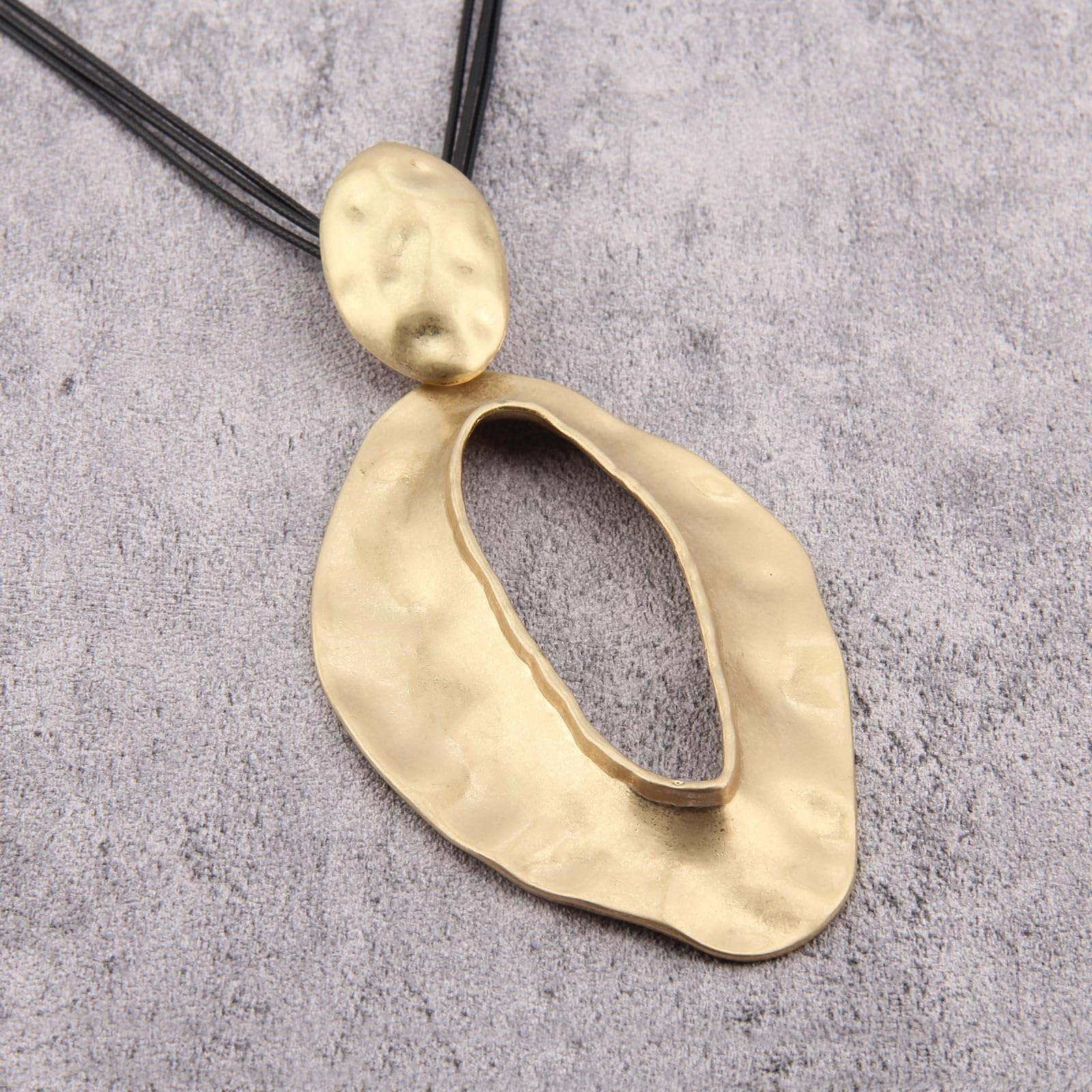 The large pendant features an abstract, organic shape with a hammered texture, exuding a handcrafted, artisanal charm.