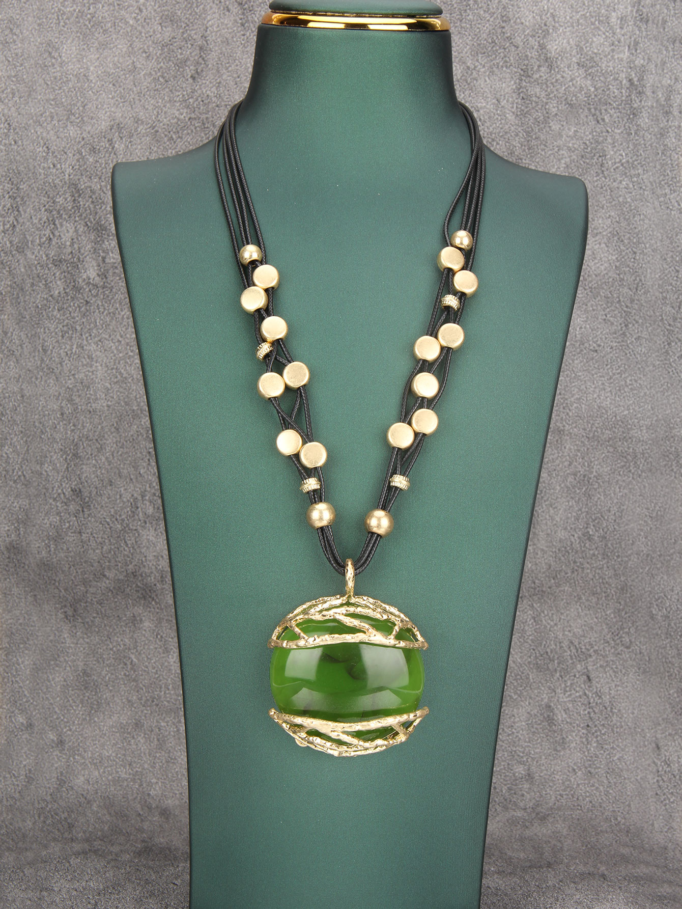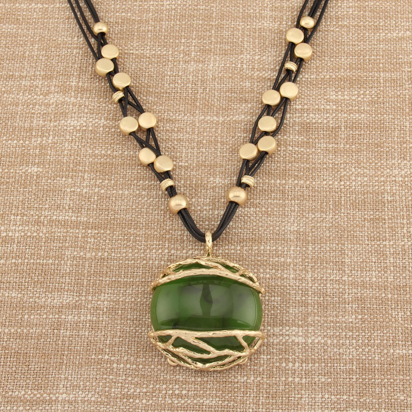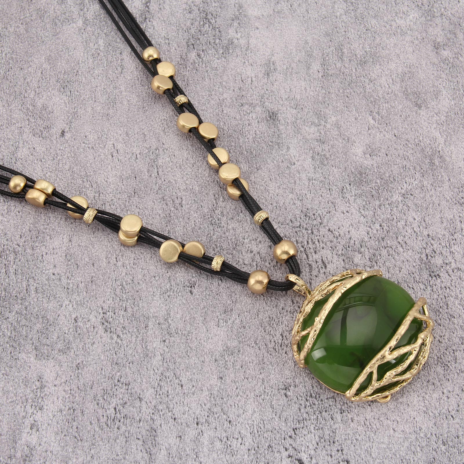 Elegant Leather Pendant Necklace with Gold and Green Resin Accents