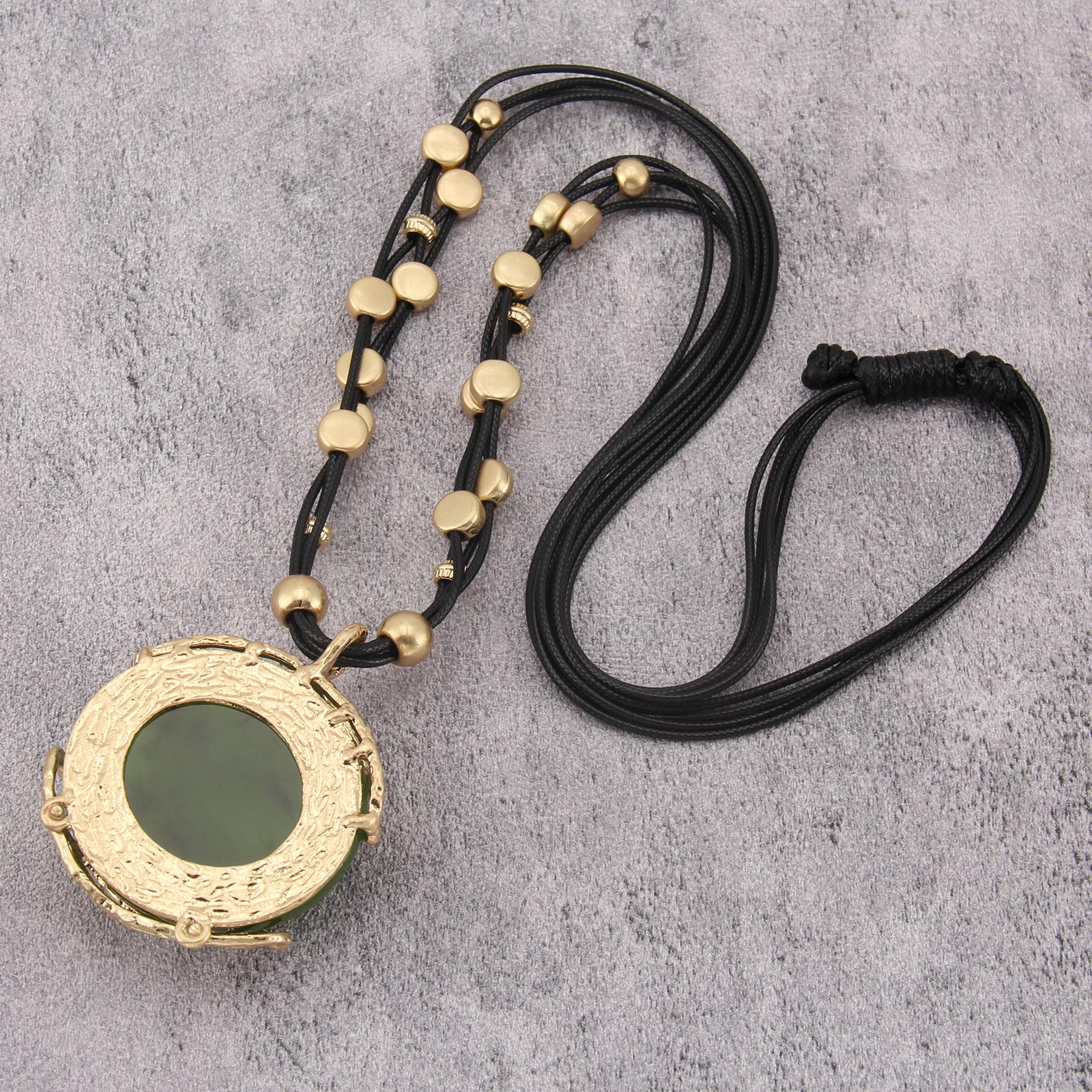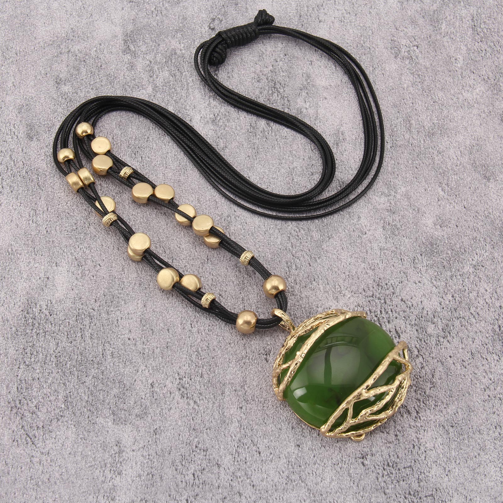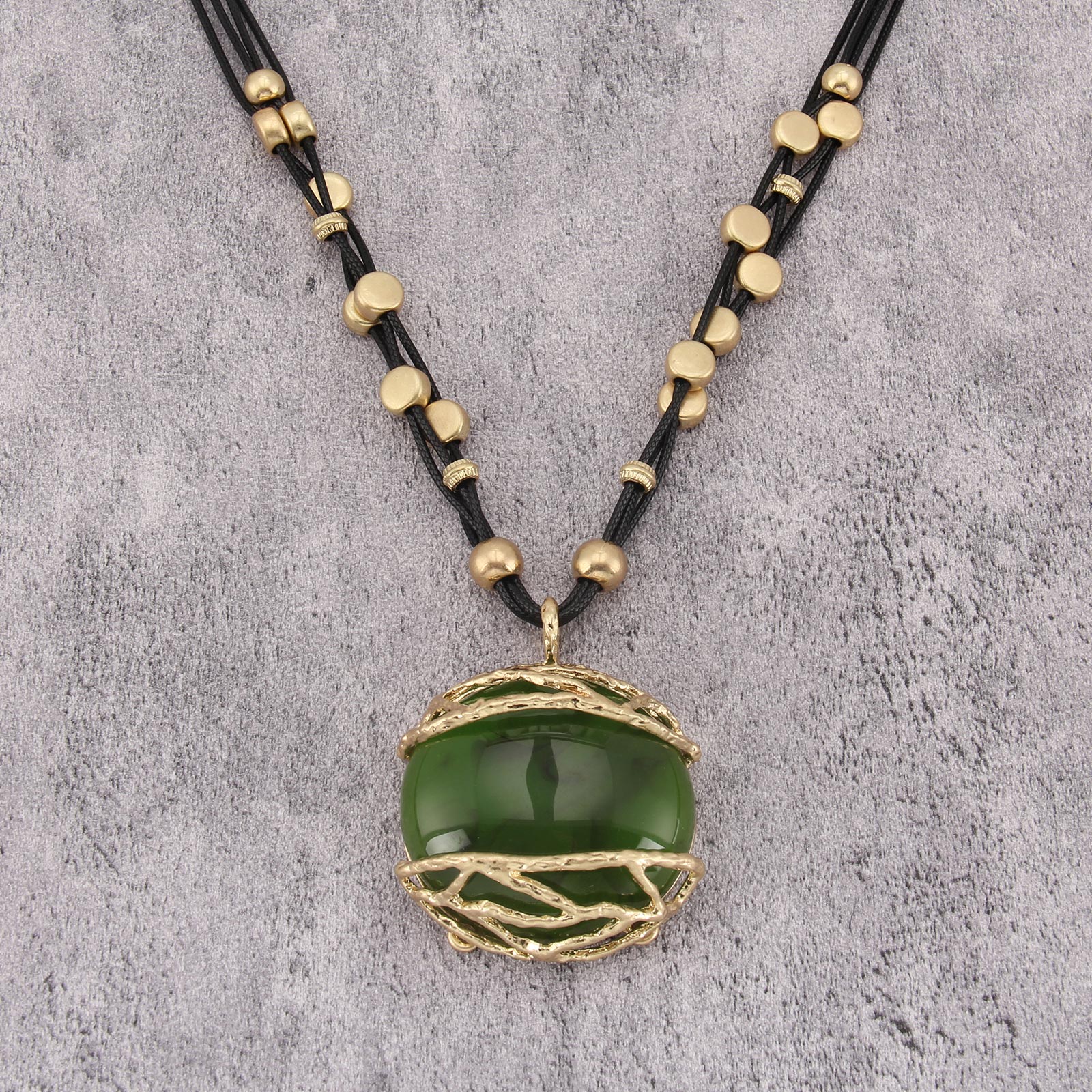 Elegant Leather Pendant Necklace with Gold and Green Resin Accents