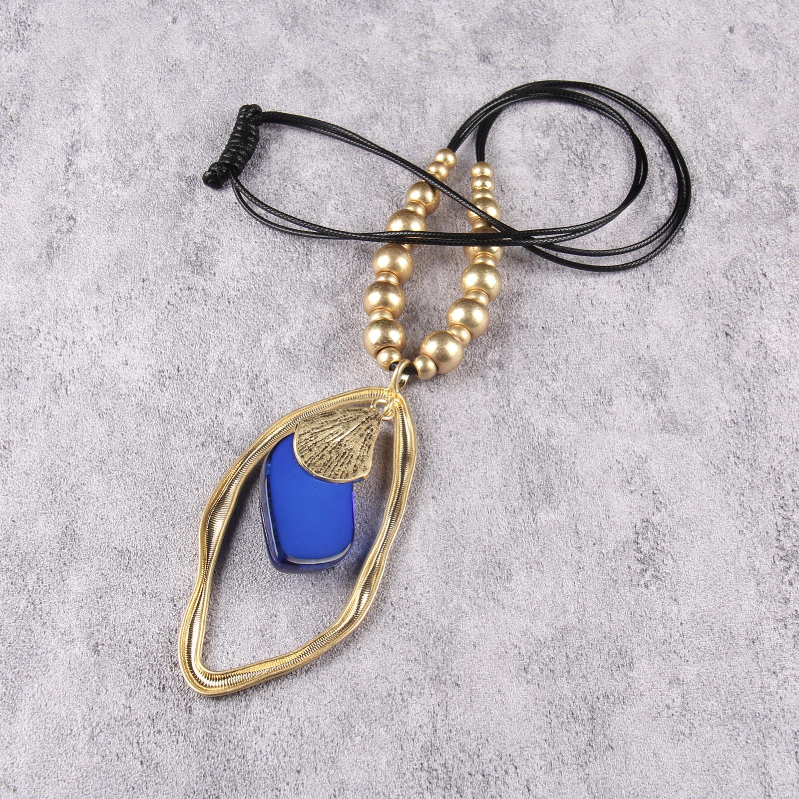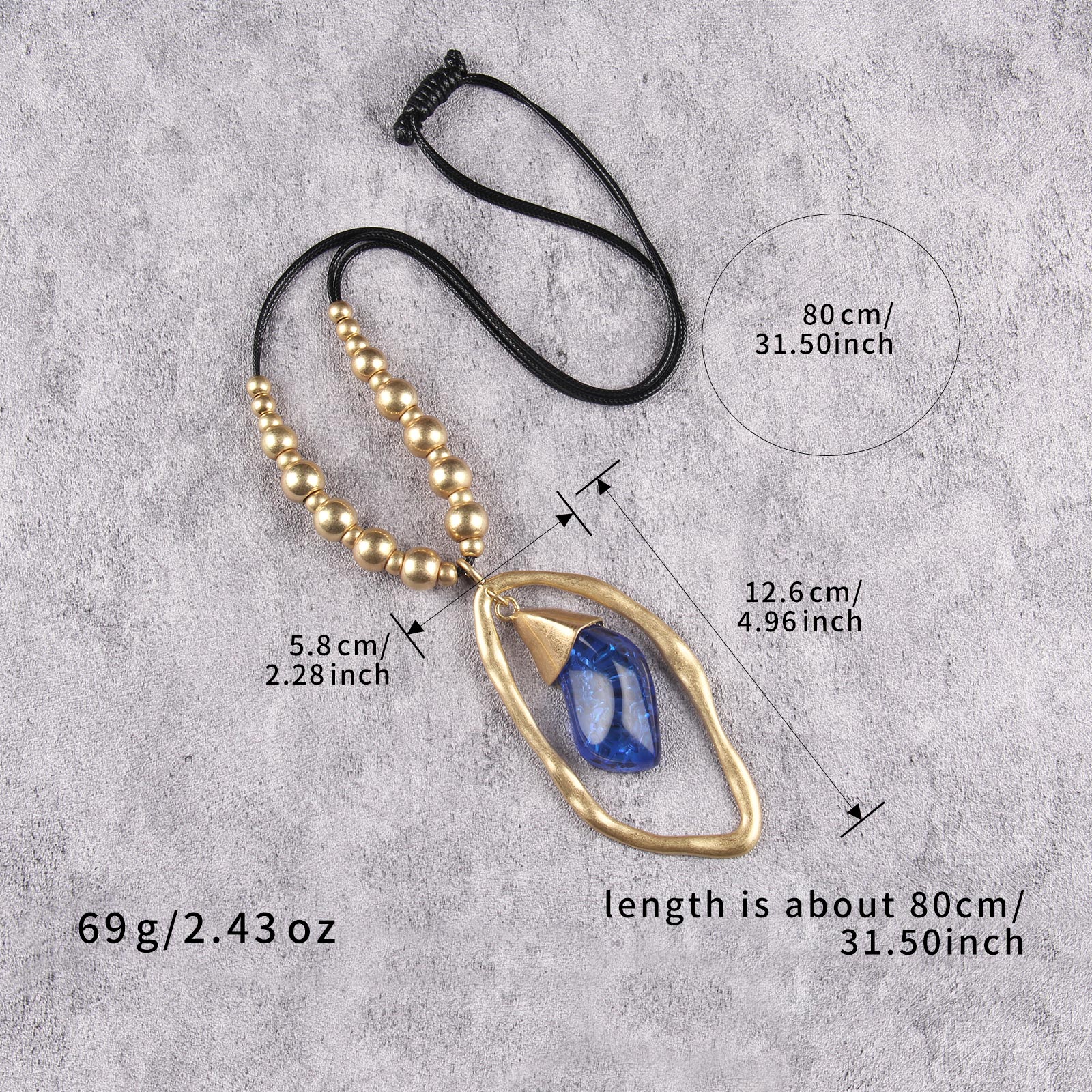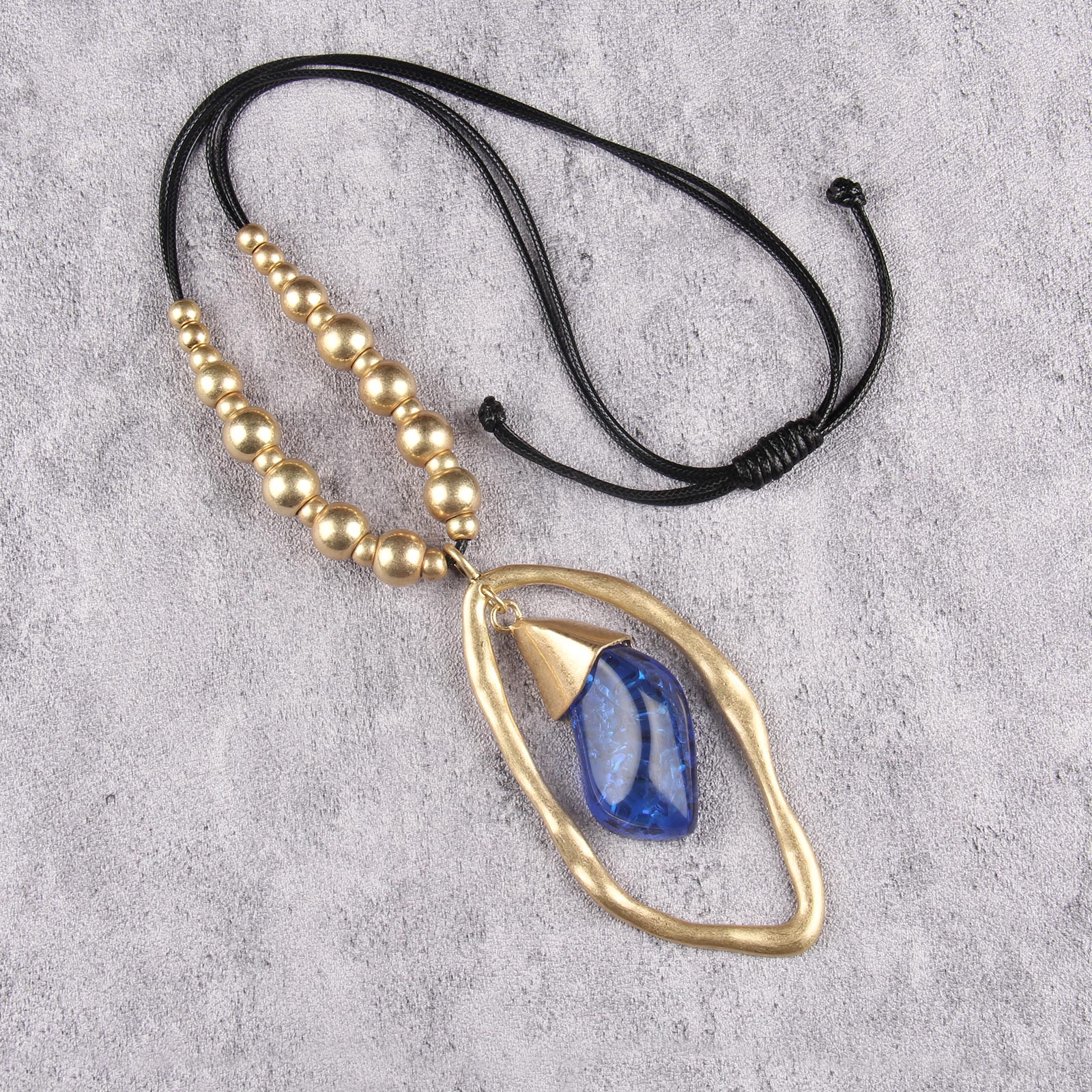 Gelconnie Boho Necklace Blue Chunky Gold Pendant Necklace Black Cord Handmade Boho Jewelry Women Choker Long Casual Necklaces