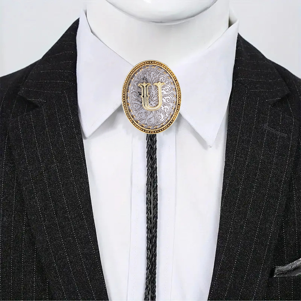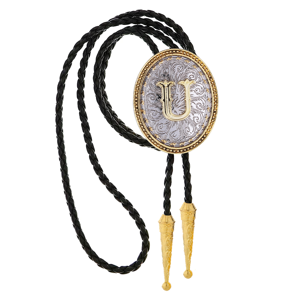 GelConnie Native American Western Cowboy Alphabet Golden Initial Letter A to Z Leather Necktie Bola Tie for Men Women