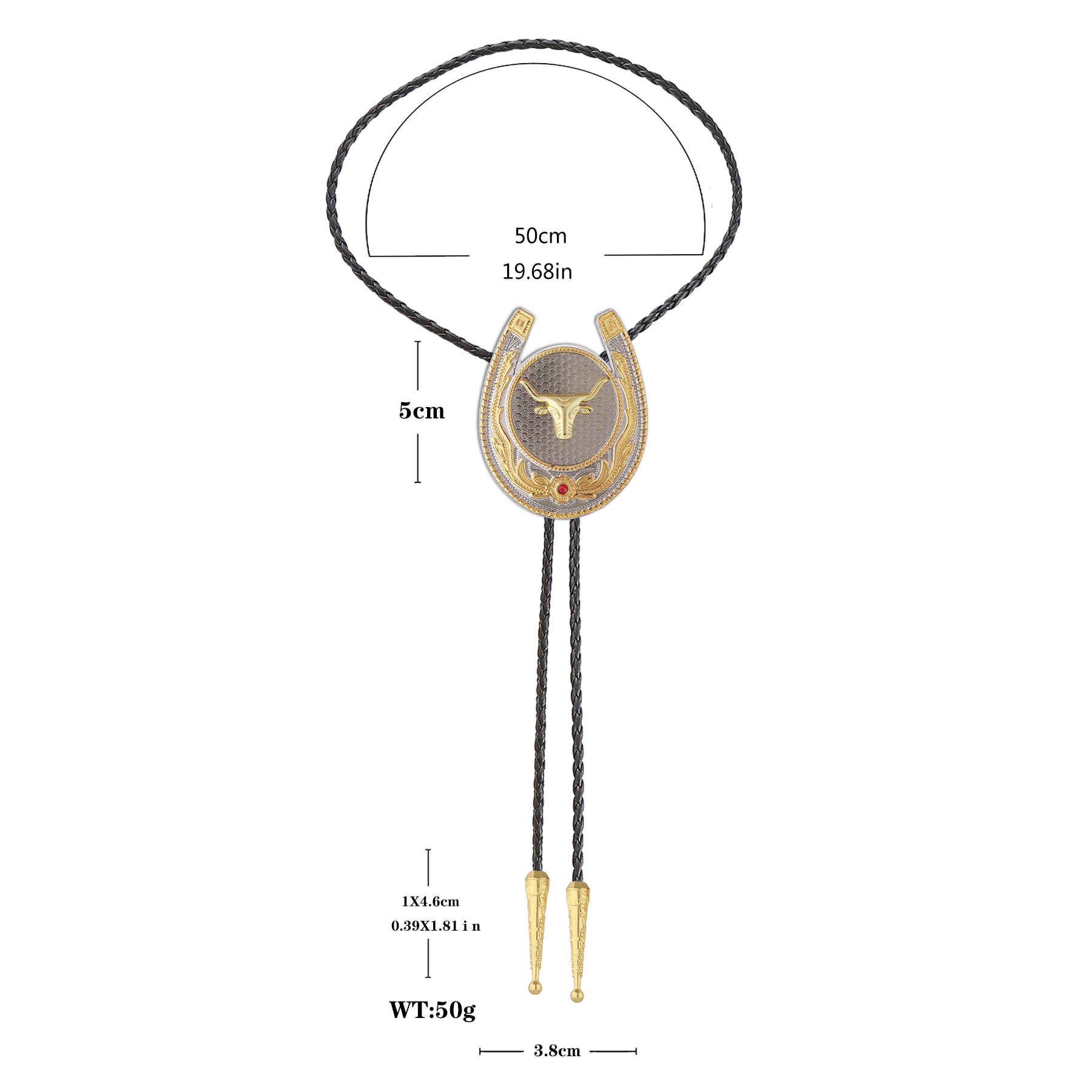 Our gold bolo tie measures leather rope length 19.7 inches,You can slide up and down to adjust the size of the tie.