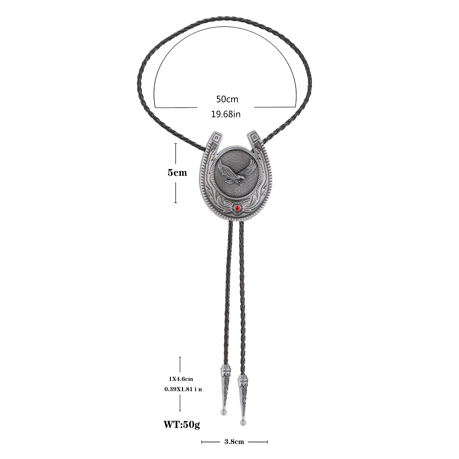 Our silver bolo tie measures leather rope length 19.7 inches,You can slide up and down to adjust the size of the tie.