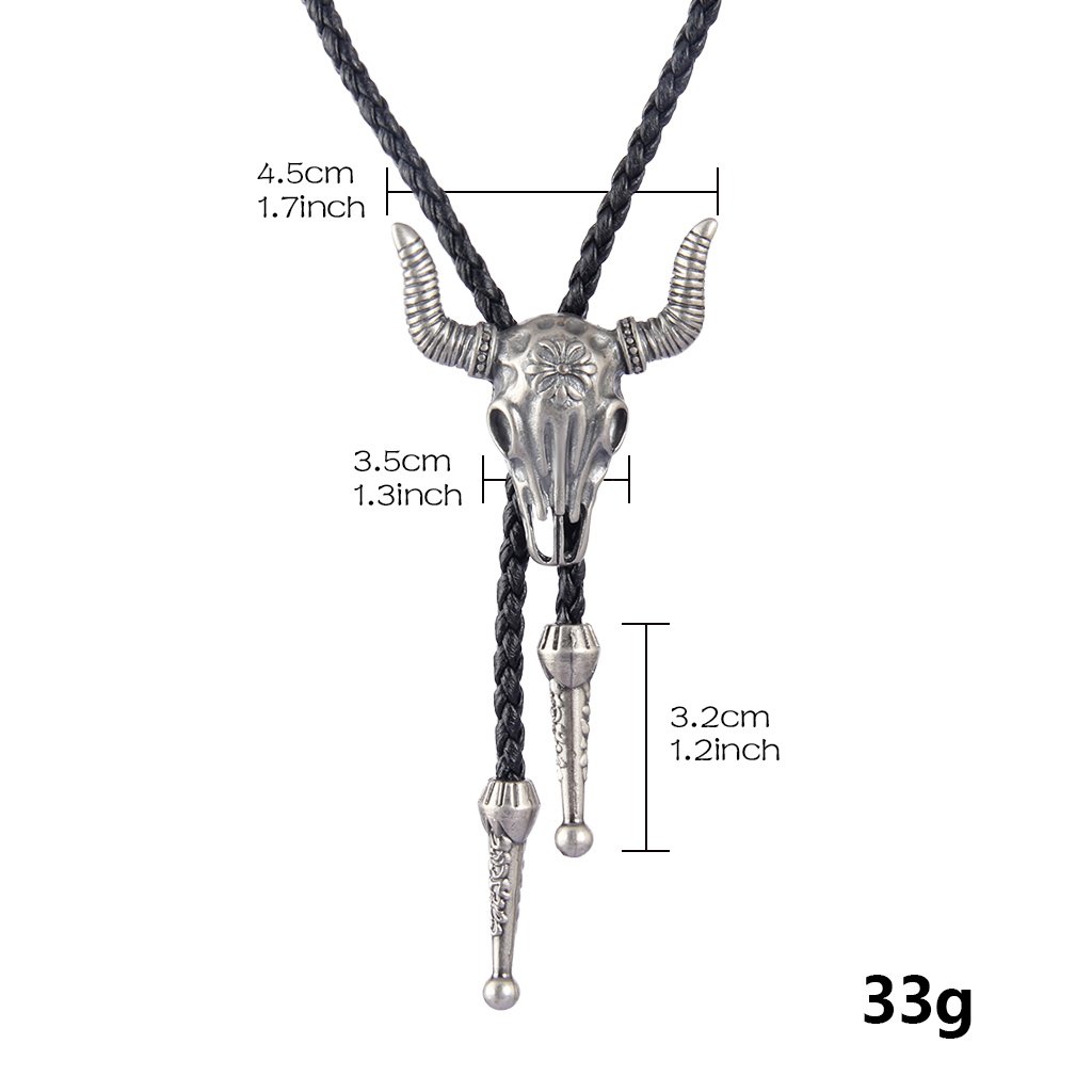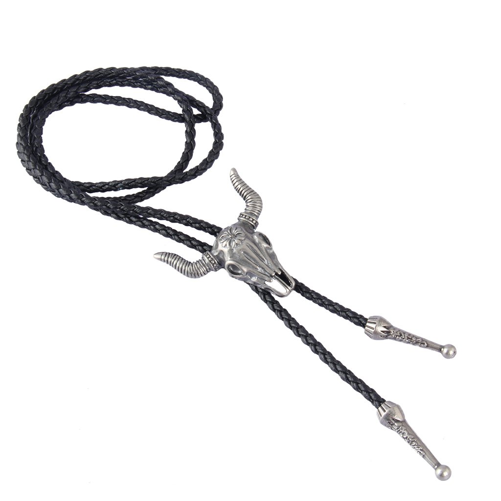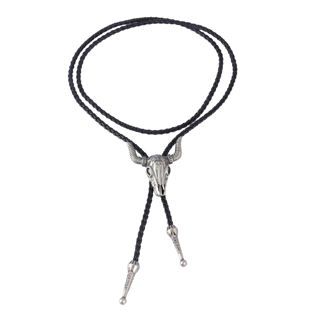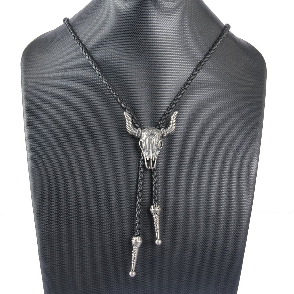 GelConnie Cowboy Skull Bolo Tie American Leather Necktie Rope Braided Necklace Western Jewelry for Men, Women PL0023-silver